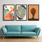 Capture earthy elegance and modern calm with this bohemian wall art set of 3 canvas prints, designed to bring warm tones and grounded beauty into your space. The first artwork features a one-tone abstract composition of sun, mountains, stairs, leaves, and a branch, styled in minimal boho linework. The second print shows a centered flower without stem, with artistic leaves placed above and below, creating natural harmony. The third canvas depicts a cactus with the sun setting directly behind it, and a glowing orange-brown evening sky, giving a desert-at-dusk vibe. This canvas wall art trio is perfect for earthy, sunset-loving, and artistic boho interiors.