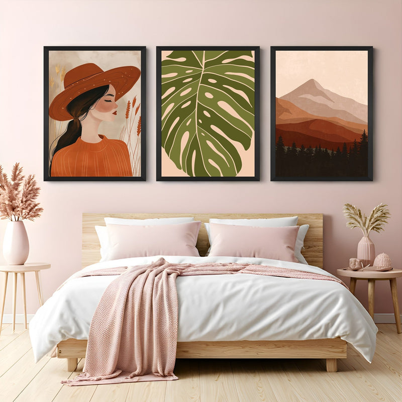 Elevate your walls with a calming blend of nature, elegance, and artistic simplicity through this beautiful boho wall art set of 3 canvas prints, perfect for minimalist and earthy interiors. The first canvas features a graceful girl in side view wearing a hat, drawn in soft tones that capture quiet femininity and timeless bohemian charm. The second showcases a clean green leaf botanical print, perfect for bringing in a refreshing natural element to your space. The third artwork completes the set with a stunning minimal mountain landscape, where each mountain is a different earthy shade, creating a layered, serene design that evokes balance and grounding. This set of 3 boho canvas wall prints blends feminine art, nature-inspired decor, and modern abstract mountains to form a peaceful and stylish trio. Ideal for bedrooms, entryways, or reading corners that need a touch of modern bohemian calm.