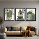 Girl in Hat Side View, Green Leaf & Minimal Mountain Art – Boho Wall Art Set of 3 Canvas Prints