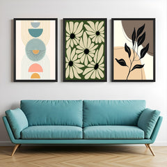 Create a soothing and artistic atmosphere with this bohemian wall art set of 3 canvas prints, blending natural details with minimal elegance. The first artwork features a clean minimalistic boho design, perfect for modern, airy spaces. The second print brings in gentle beauty through a soft floral-inspired composition, ideal for flower lovers and earthy decor. The third canvas showcases two curved abstract shapes filled with muted colors, accented with delicate leafy elements, giving it a layered, organic look. This set of 3 canvas wall art is perfect for living rooms, bedrooms, or creative corners with boho, minimalist, or botanical themes.