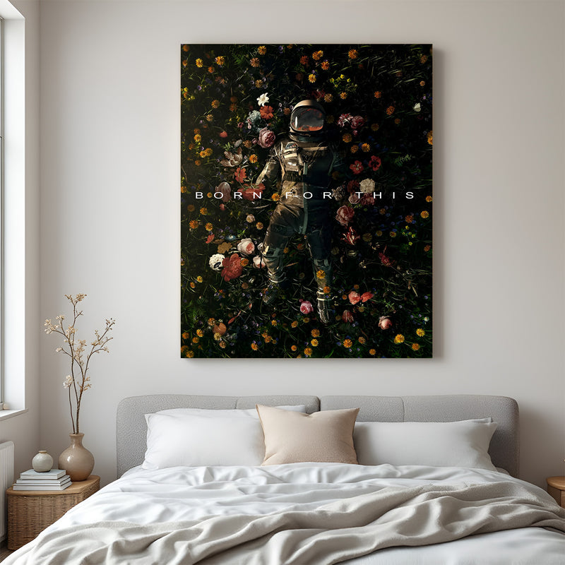 Step into a world of wonder and confidence with this astronaut canvas wall art featuring a serene space traveler lying on a bed of vibrant flowers, surrounded by nature and dreams. With the powerful motivational quote “Born for this” written across the artwork, this piece symbolizes self-belief, purpose, and inner peace.
