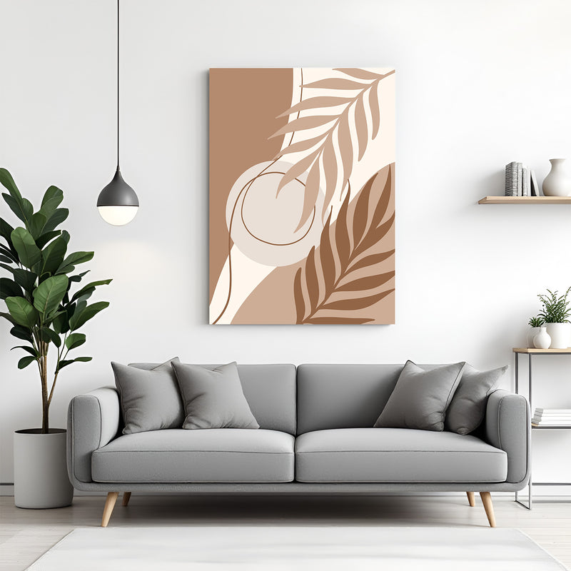 This brown toned minimal canvas wall art celebrates simplicity with a warm, grounded palette. Featuring soft abstract shapes in layered brown hues and elegant leaf accents, the artwork blends natural textures and boho minimalism into a serene visual composition.