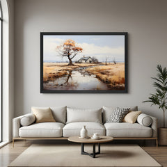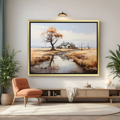 Embrace the quiet beauty of countryside serenity with this vintage canvas art featuring a charming house and tree with reflection in the river, captured in a soft, nostalgic ancient-style wall art aesthetic. This calming canvas printed wall art showcases a peaceful landscape where a rustic home sits beside a large, timeless tree, both mirrored gracefully in the still waters of a river. Rendered in muted tones and delicate brushwork, the artwork radiates old-world calm and natural harmony, making it perfect for bedrooms, hallways, reading nooks, or tranquil interiors. Whether you're drawn to scenic nature, emotional stillness, or rustic charm, this vintage canvas art offers both visual depth and meditative elegance. It’s an ideal piece for those who love canvas printed wall art with storybook warmth and countryside simplicity, wrapped in an ancient-style wall art composition that turns any space into a poetic escape. Also suits soft, nature-inspired winter wall decor beautifully.
