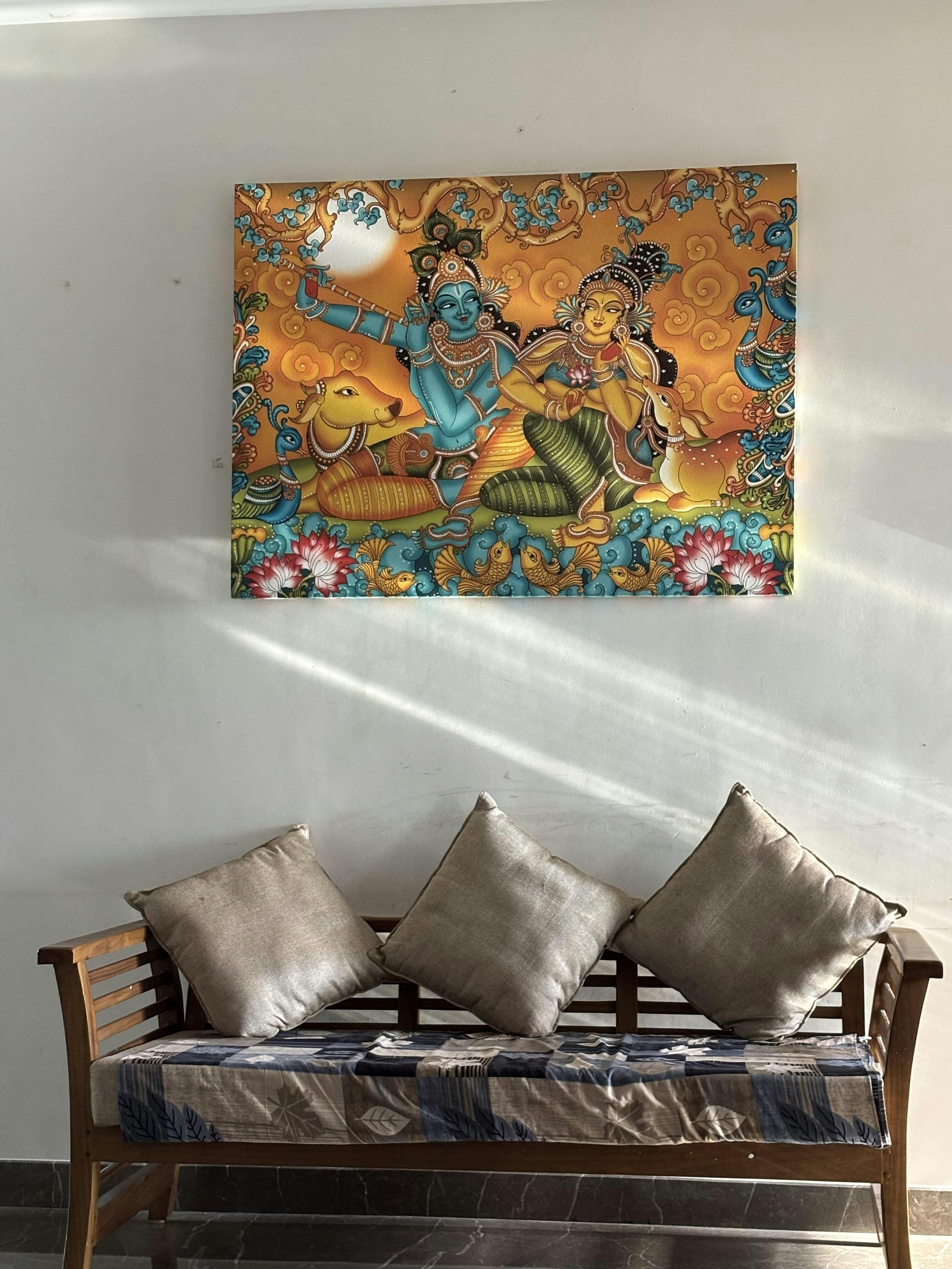 This Radha Krishna Kerala mural canvas painting beautifully captures divine love in a traditional South Indian art style, featuring intricate details and warm earthy tones. Inspired by temple murals, this Kerala mural wall art is perfect for spiritual homes seeking Radha Krishna paintings, ethnic Indian wall decor, Vastu canvas art, and devotional mural artworks. Ideal for pooja rooms, meditation areas, or living spaces, this canvas painting brings a serene, culturally rich atmosphere with spiritual essence and timeless elegance. Enhance your interiors with this sacred and artistic Radha Krishna mural canvas rooted in heritage and love.