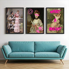 Add a mix of attitude, creativity, and mystery to your interiors with this set of 3 altered art canvas wall prints, designed to express humor, style, and emotion through bold visuals and quirky text. The first canvas shows a man gently consoling a woman who’s turned away, with the sassy caption “This Could Be Us But You’re Plain,” turning a romantic moment into pure sarcasm. The second features a woman’s portrait with pink paint splashes, a painted smiley face, and pink brush strokes across her eyes, creating a striking modern art aesthetic. The third artwork captures a pensive woman standing beside a tree with the line “What a Night,” evoking curiosity and contemplation. Printed on high-quality canvas and framed in sleek black floater frames, this altered art trio is perfect for modern home decor, bedroom walls, or creative office spaces. Ideal for lovers of paint splash art, funny quote wall decor, and moody aesthetic prints, this set adds personality, visual intrigue, and expressive energy to any wall.