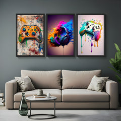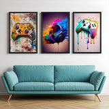 Bring energy, creativity, and bold style to your space with this set of 3 abstract canvas wall art prints featuring gaming and music-inspired designs. The first wall art showcases a vibrant Xbox controller in an abstract, artistic style—perfect for gamers. The second canvas features color-exploding headphones, symbolizing sound, rhythm, and dynamic motion with splashes of bright paint and creative energy. The third wall art depicts another gaming console with paint dripping, offering a unique abstract gamer aesthetic that blends movement and creativity. This gaming and music canvas wall art trio is ideal for modern home decor, gaming rooms, teen bedrooms, or creative office spaces. Printed on high-quality canvas and set in sleek black floater frames, this set adds a cool, colorful, and energetic vibe to your wall. A perfect pick for lovers of gaming decor, headphone art, and abstract wall prints that make a bold statement.