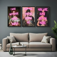 Turn up the attitude and color with this set of 3 altered art canvas wall prints, each featuring a striking woman with bold pink text overlays that command attention. The first canvas reads “I Was Not Made to Be Subtle”, radiating confidence and self-expression. The second features a chic woman with the caption “Darling, You Are Boring Me”, delivering effortless sass. The third showcases a playful girl with the cheeky quote “You Are Cute, But I Am More.” All three are designed in a contemporary altered art style, finished in sleek black floater frames, and perfect for modern interiors, fashion-forward bedrooms, or stylish offices. Ideal for lovers of sassy quote wall art, pink aesthetic decor, or feminine pop art canvas prints, this set brings humor, elegance, and bold energy to any wall.