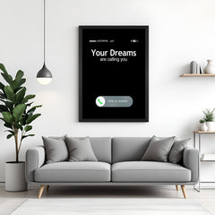 Stay motivated every day with this inspiring motivational canvas printed wall art that boldly features the quote "Your Dreams Are Calling" alongside a sleek phone call button graphic, reminiscent of a smartphone screen. Perfect for home offices, workspaces, studios, and creative rooms, this canvas printed wall painting encourages you to answer your inner calling and take action toward your goals and ambitions. Crafted on premium quality, fade-resistant canvas, this wall art adds a modern and energetic vibe to any space. Whether framed in elegant black or luxurious golden floater frames, or displayed frameless for a minimalist look, this piece is ideal for anyone passionate about personal growth, success, and daily motivation. Elevate your room’s decor with this powerful canvas wall art, designed to remind you that your dreams are just a call away.